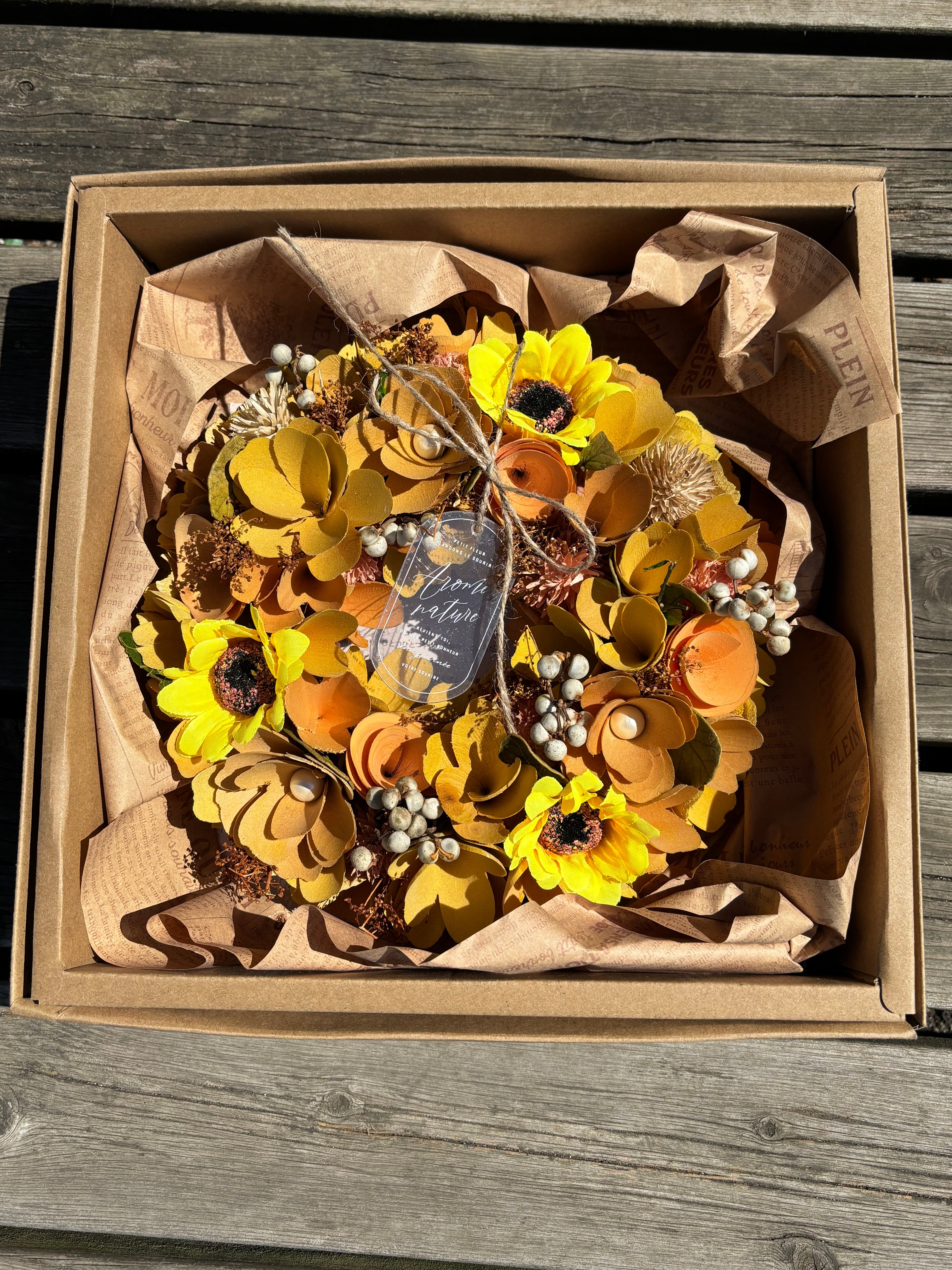 このリースは、自然素材とこだわりのデザインが見事に融合した逸品で、飾るだけで明るい印象を演出します。あなたのスタイルに素敵なアクセントを加え、友人や家族との楽しい会話のきっかけになることでしょう!このひまわりリースが、あなたのライフスタイルにさらなる喜びをもたらしてくれることをお楽しみに。