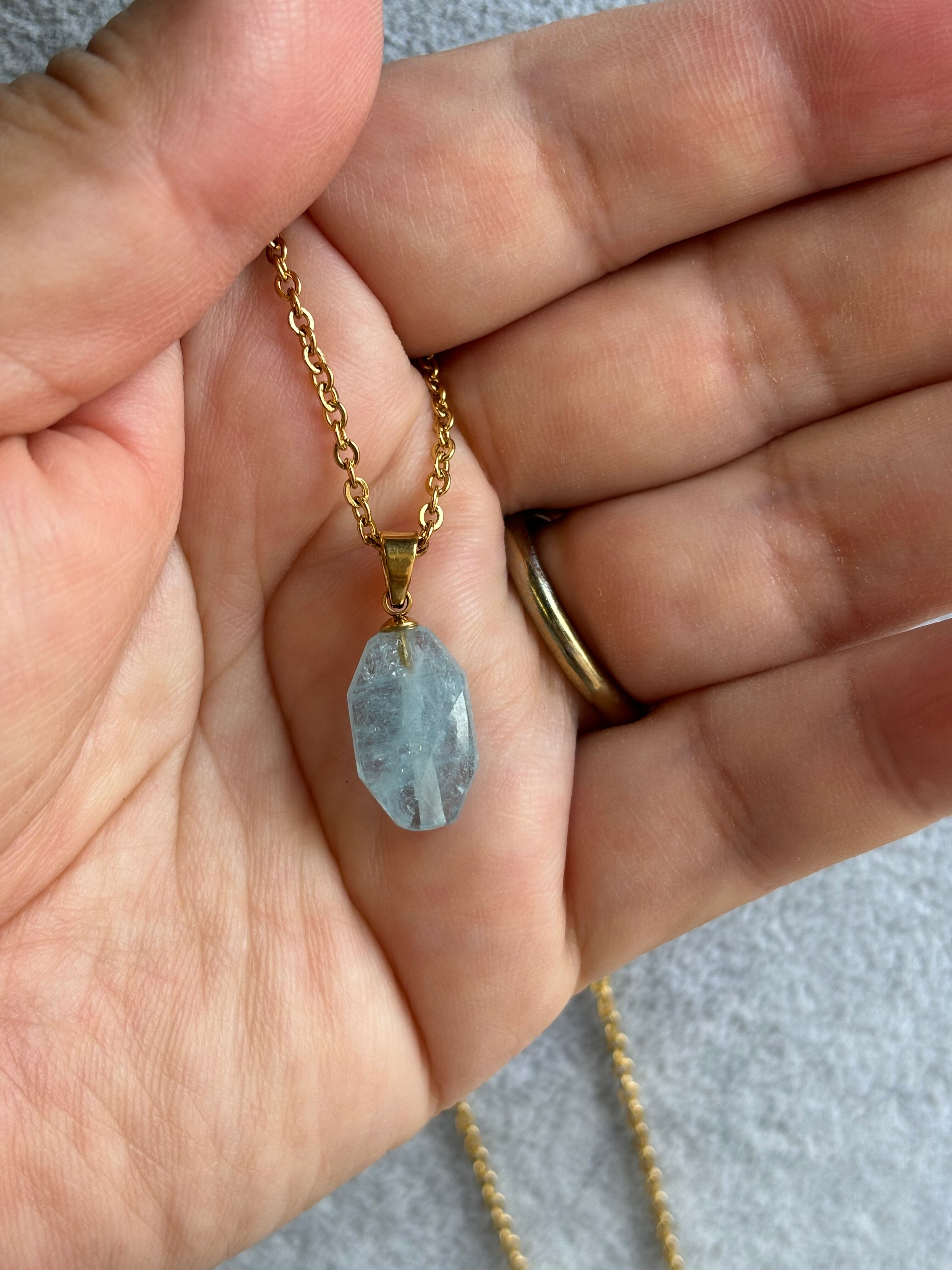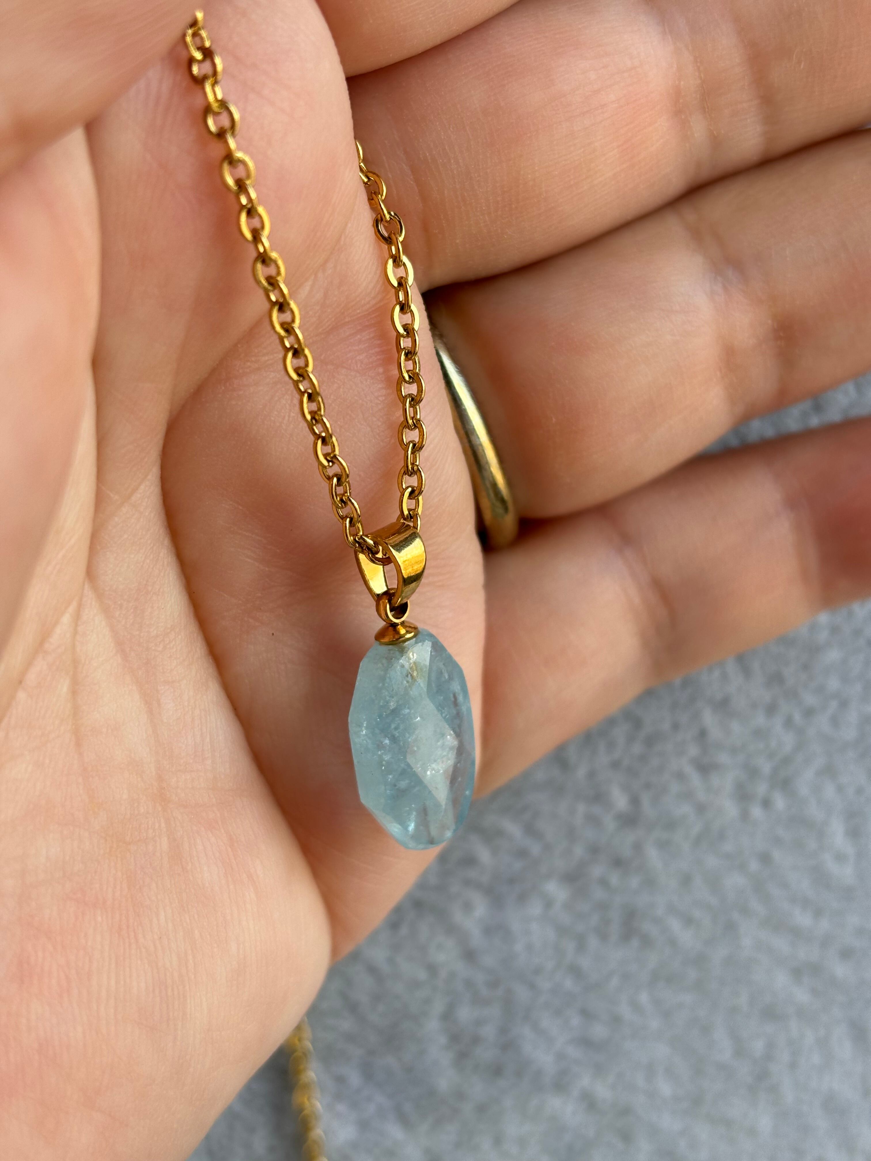 このアクアマリンペンダントトップは、自然から採取された天然石を贅沢に使用した、美しいジュエリーです。透明感のあるアクアマリンが、光を受けてキラキラと輝きます。シンプルなデザインながらも、存在感があり、どんなコーディネートにも合わせやすいのが魅力です。洗練された大人の女性におすすめのアイテムです。