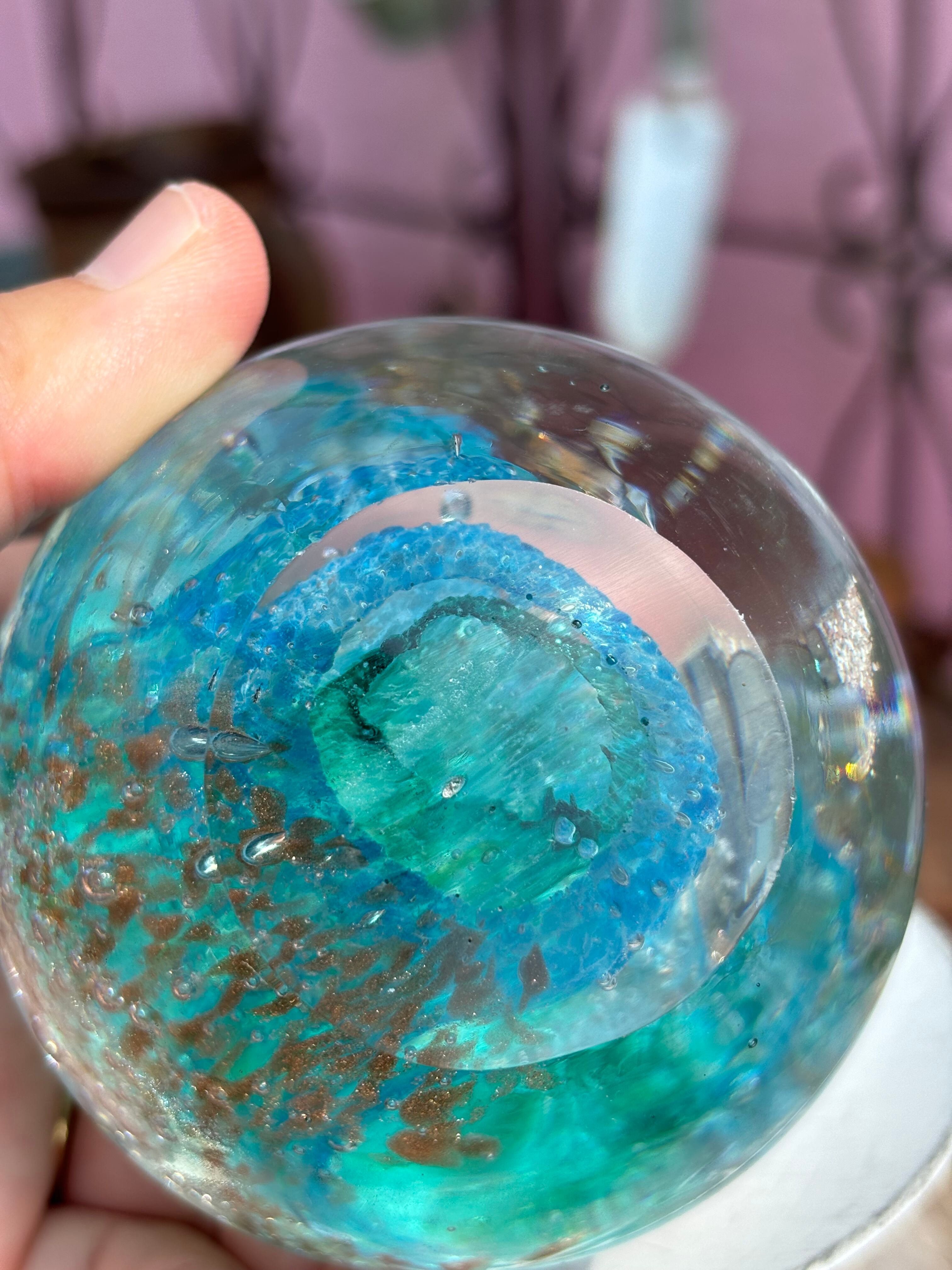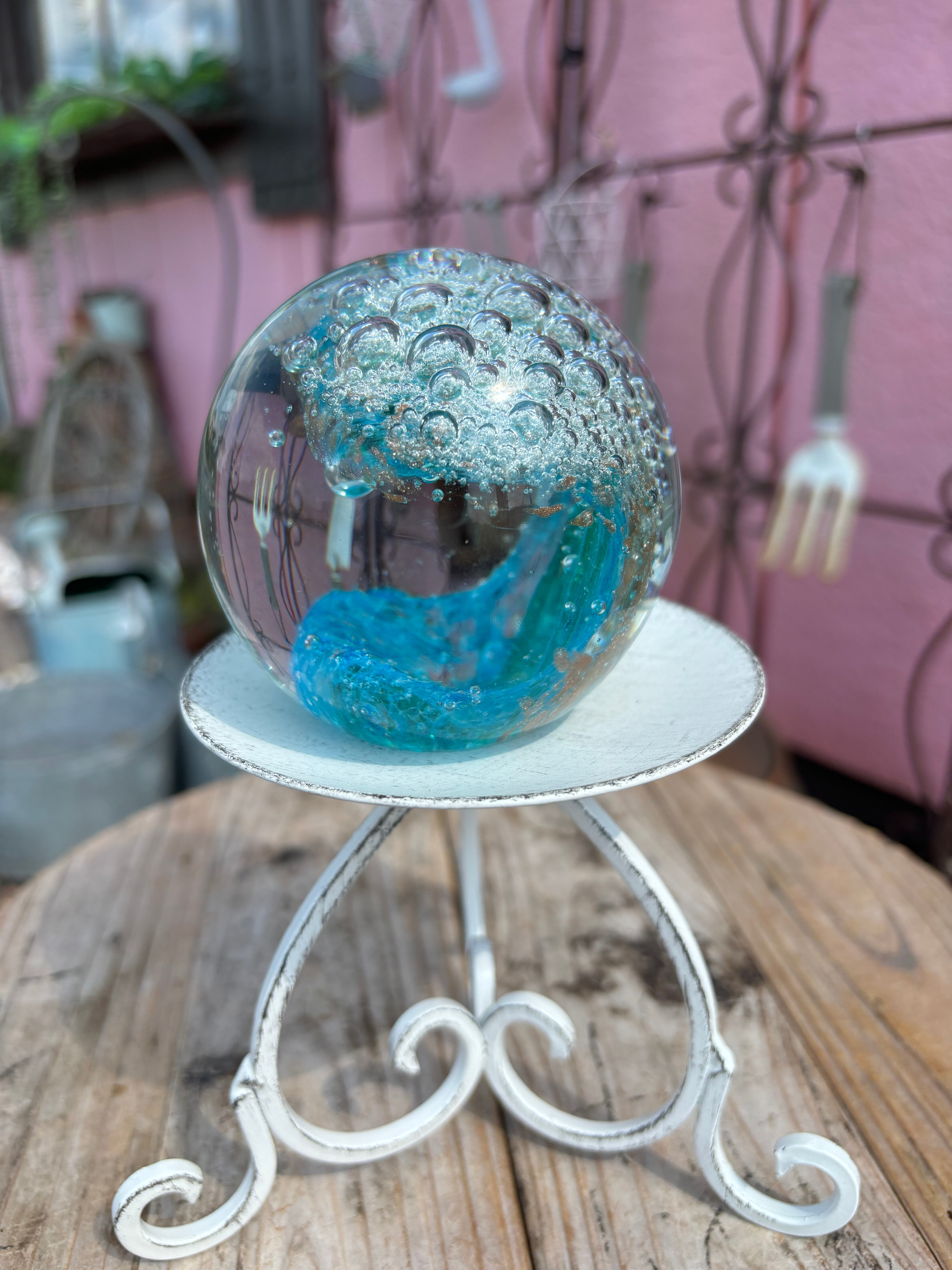 ガラス製ペーパーウエスト【ウェーブ スカイブルー】は、繊細なウェーブ模様が美しいアートピースです。職人がひとつひとつ手作業で丁寧に作り上げた、ユニークでエレガントなデザインが特徴。インテリアに華やかさをプラスするだけでなく、光が当たると宝石のような輝きを放ちます。空気感を感じさせるスカイブルーの色使いは、心地よいリラックス感をもたらします。洗練された空間を演出したい方におすすめの逸品です。