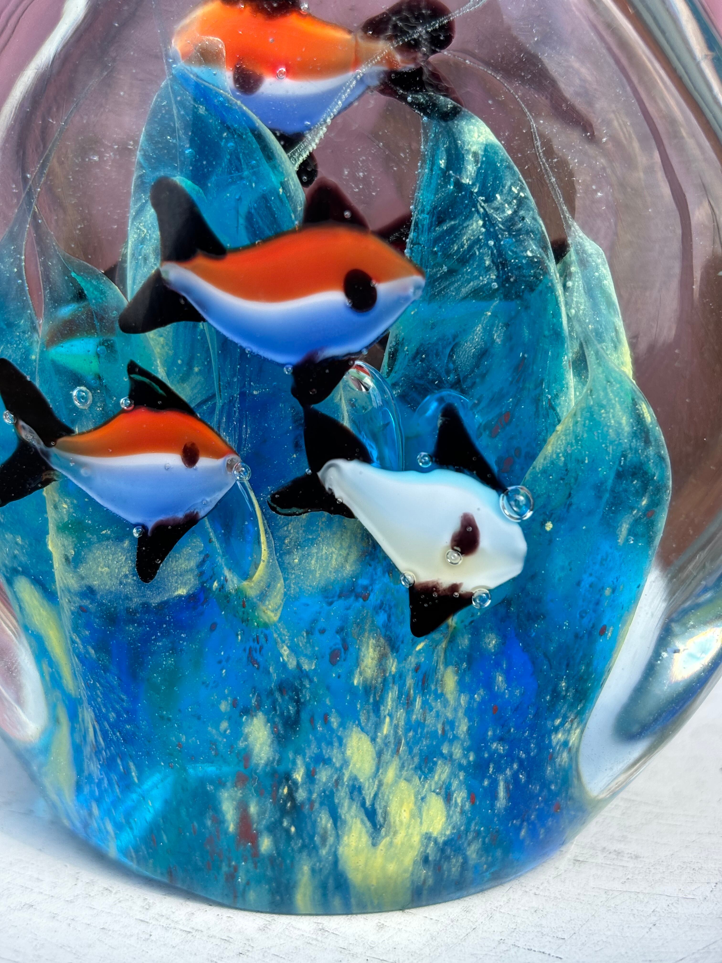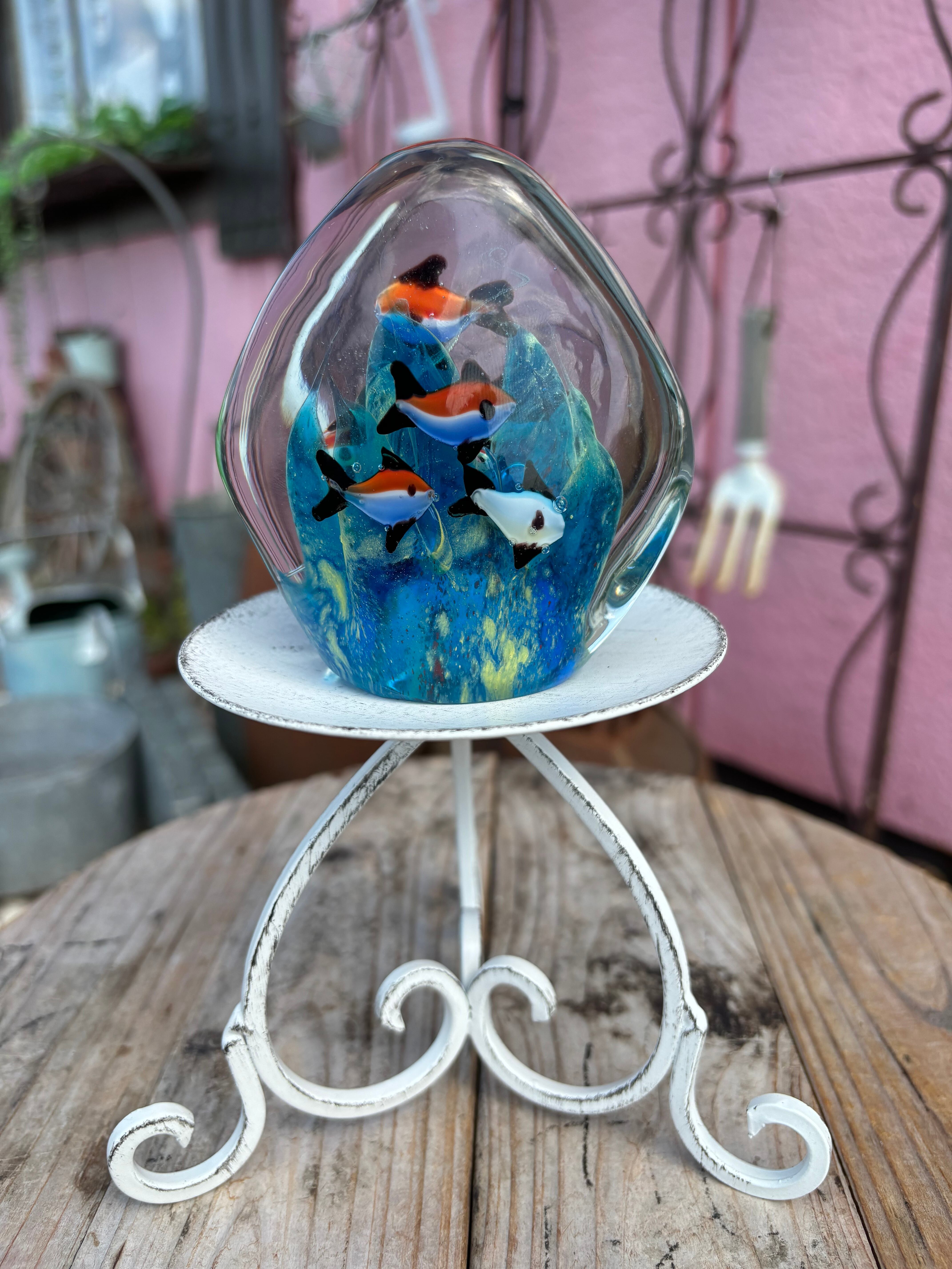 ガラス製 ペーパーウエスト 【スクエア型熱帯魚】は、美しい熱帯魚の模様とユニークなデザインが特徴のインテリアアイテムです。手作りのため、それぞれの一匹が個性豊かな表情を持っています。お部屋の中にこの熱帯魚を飾れば、まるで海の中をのぞいているような幻想的な雰囲気を楽しむことができます。