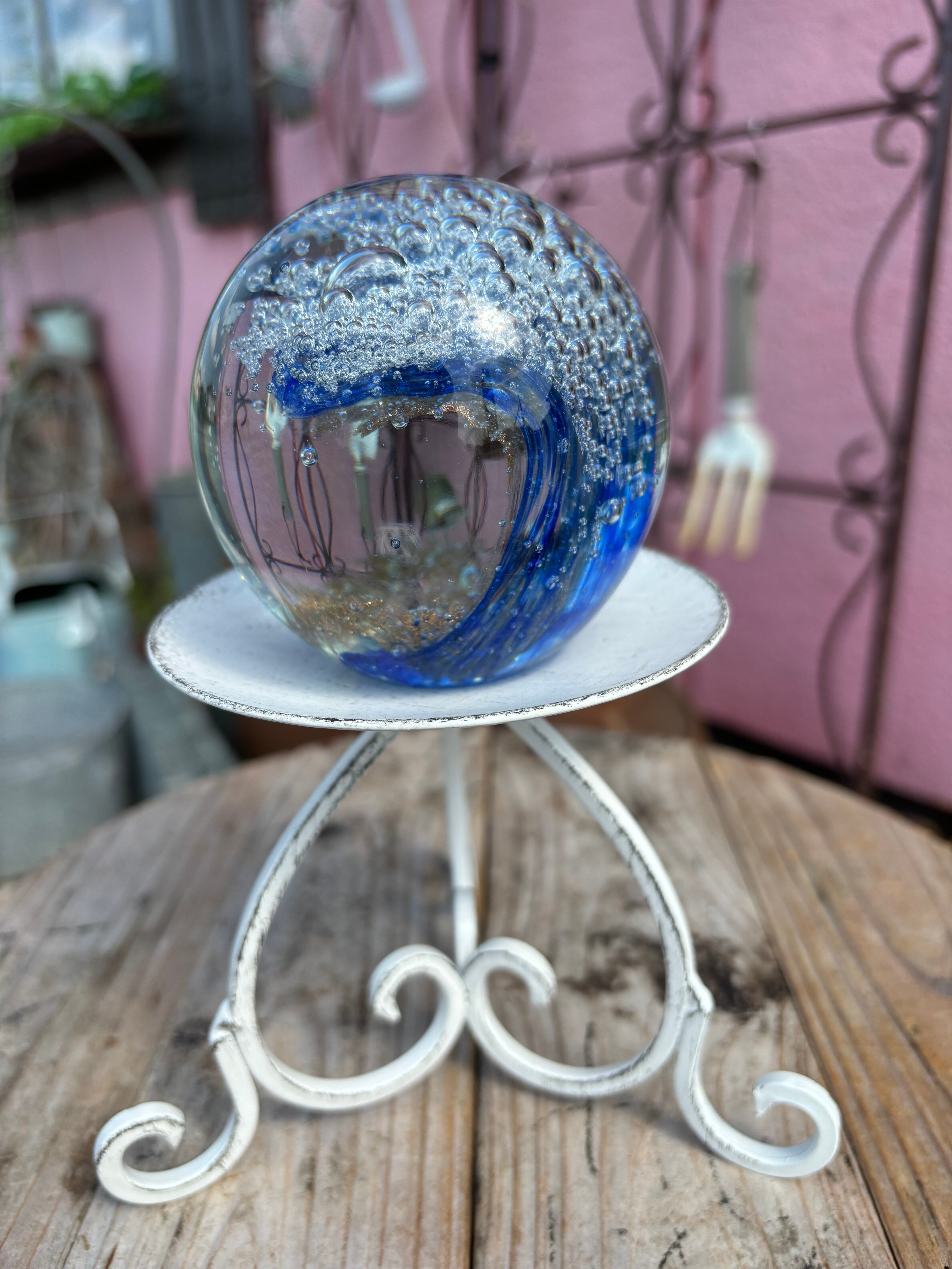 職人が一つひとつ手作業で丁寧に作り上げた、贅沢なガラス製のペーパーウエスト。ブルーグラデーションのウェーブ模様が、光を受けると幻想的にキラキラと輝きます。お部屋に置いているだけでも、空間に遊び心とエレガンスをプラスします。