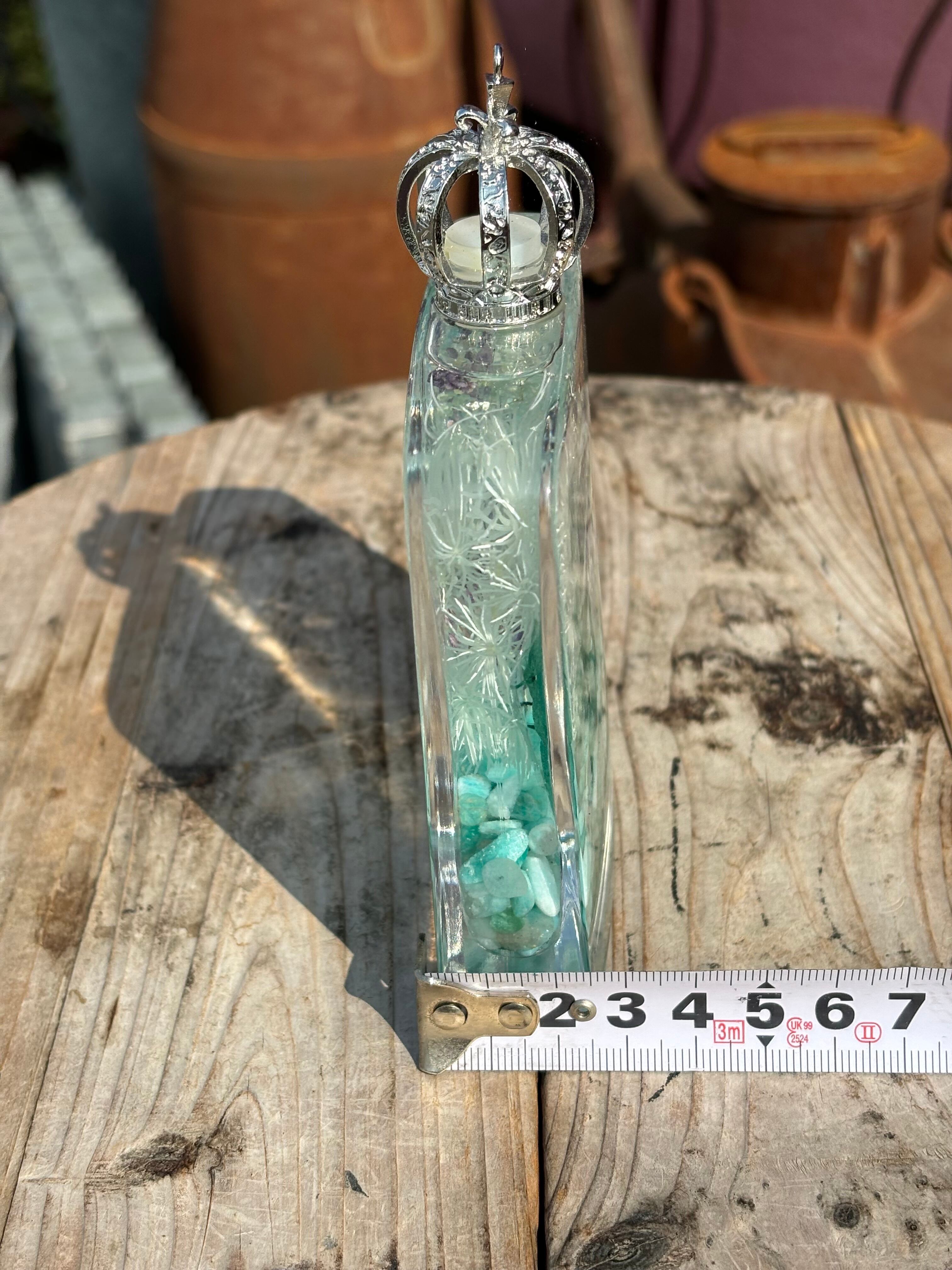 天然石さざれ入りハーバリウム【イルカ】は、癒し効果のあるハーバリウムに、特別な意味を持つ天然石を加えたアイテムです。イルカが描かれたガラス容器に浮かぶ、美しい緑色の植物と天然石が調和したデザインは、部屋においてリラックス効果をもたらしてくれます。